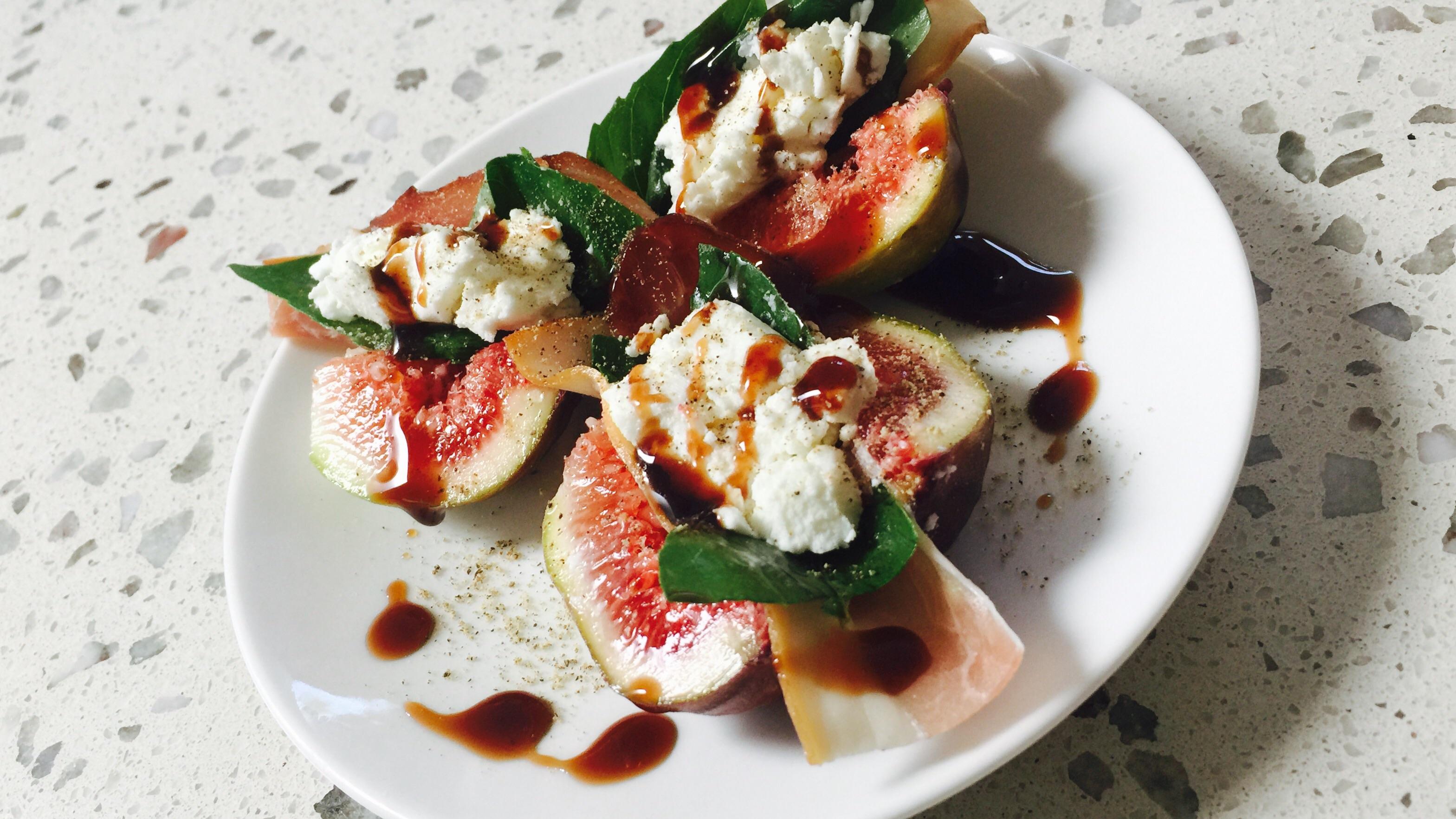 Fresh figs with smoked prosciutto, goats cheese, basil, drizzled with a balsamic fig glaze