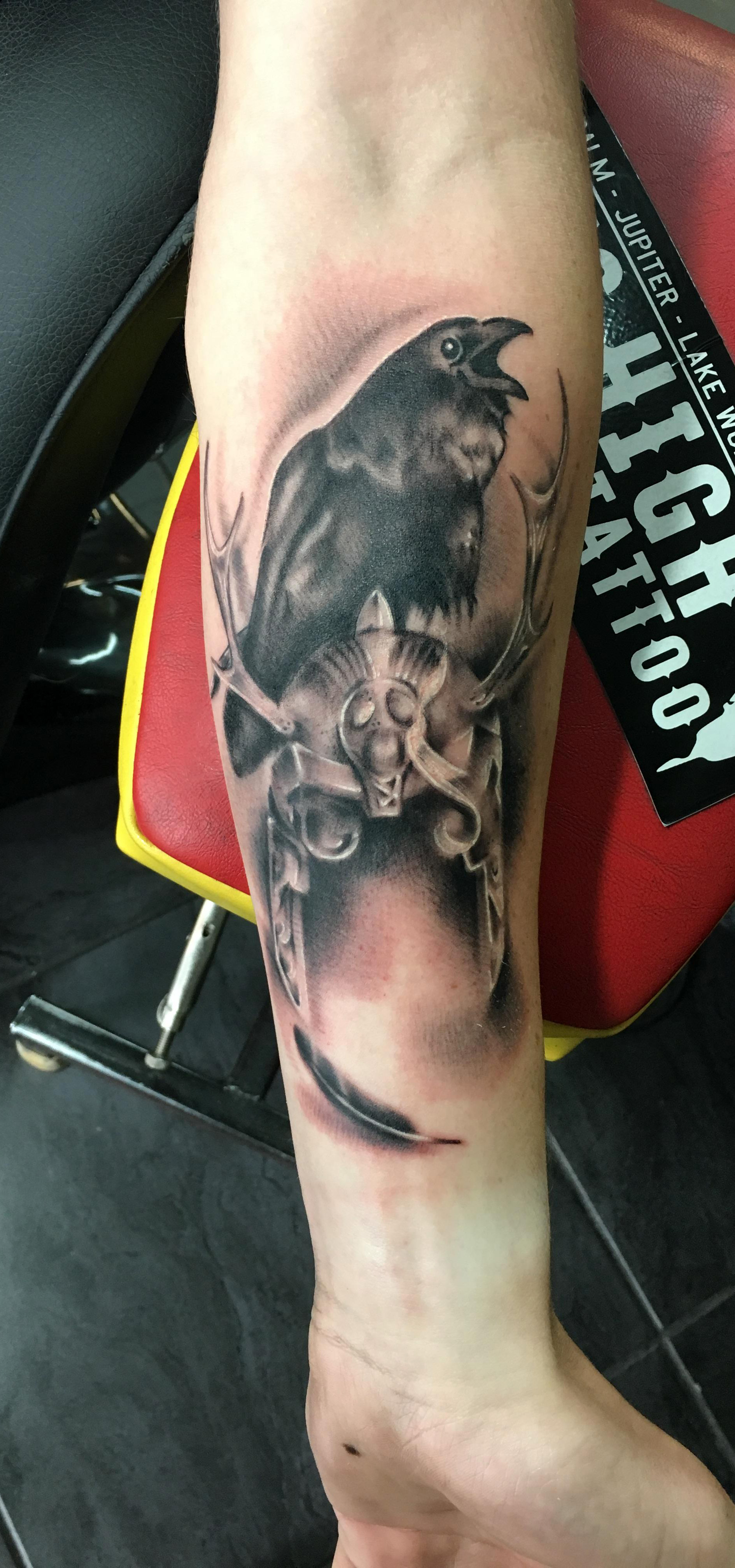 Odin's Raven and Helmet, tattoo by Jay Kowalski at Aces High Jupiter, FL