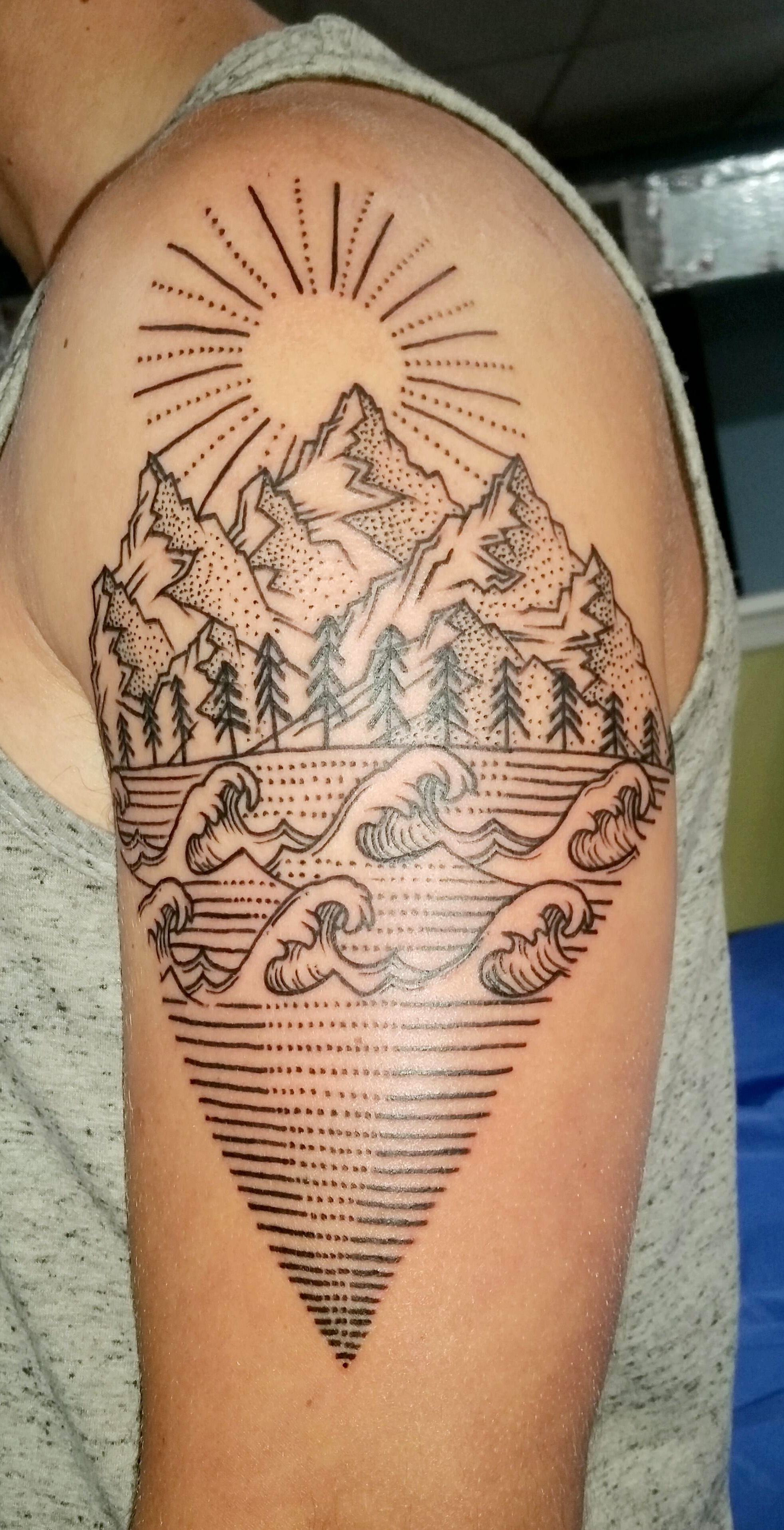 Mountains and waves tattoo, by Kevin Joseph at East Coast Worldwide. Jacksonville Beach, FL