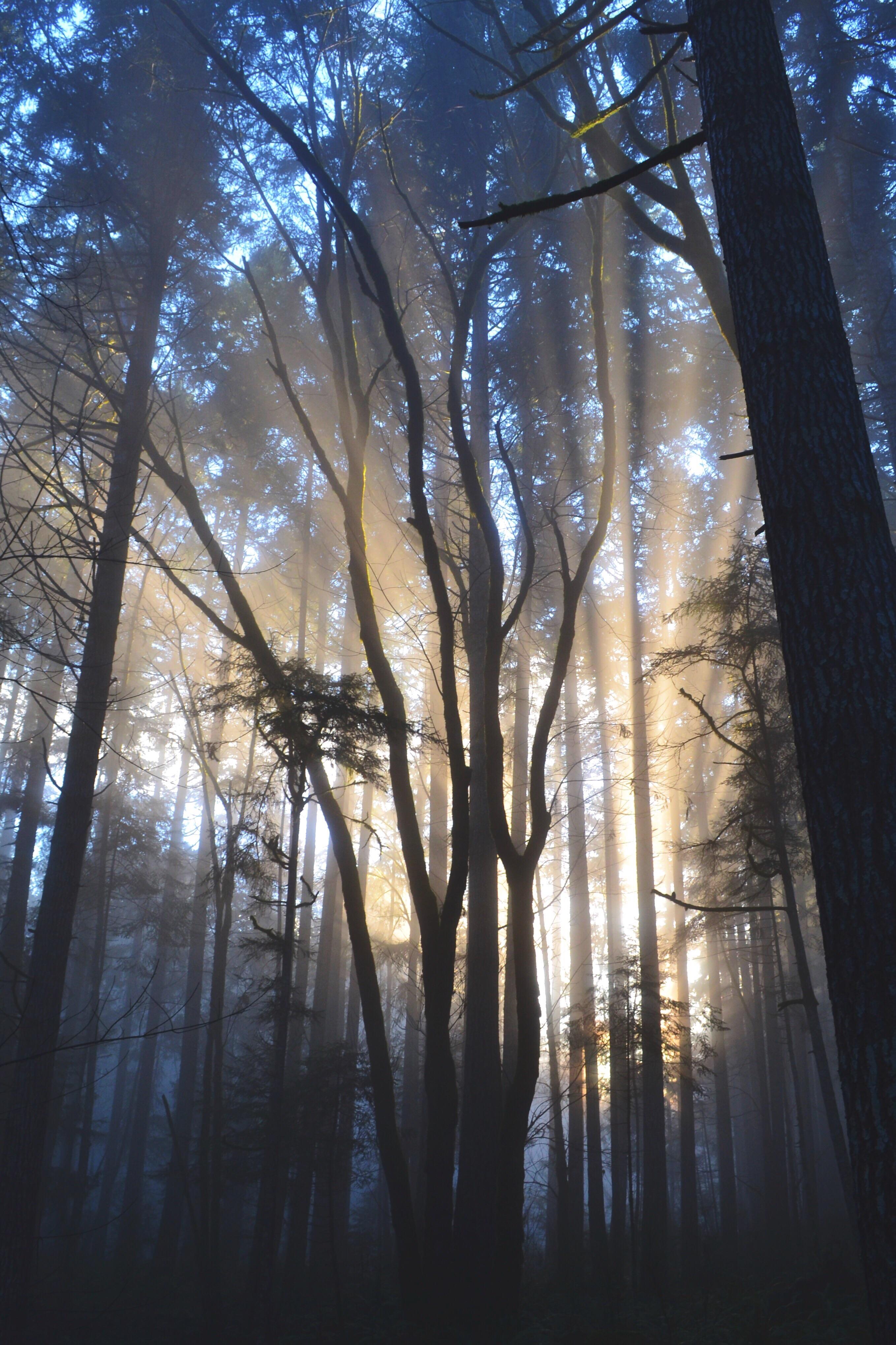 The sun set through the trees after a heavy rain. Vancouver Island, British Columbia