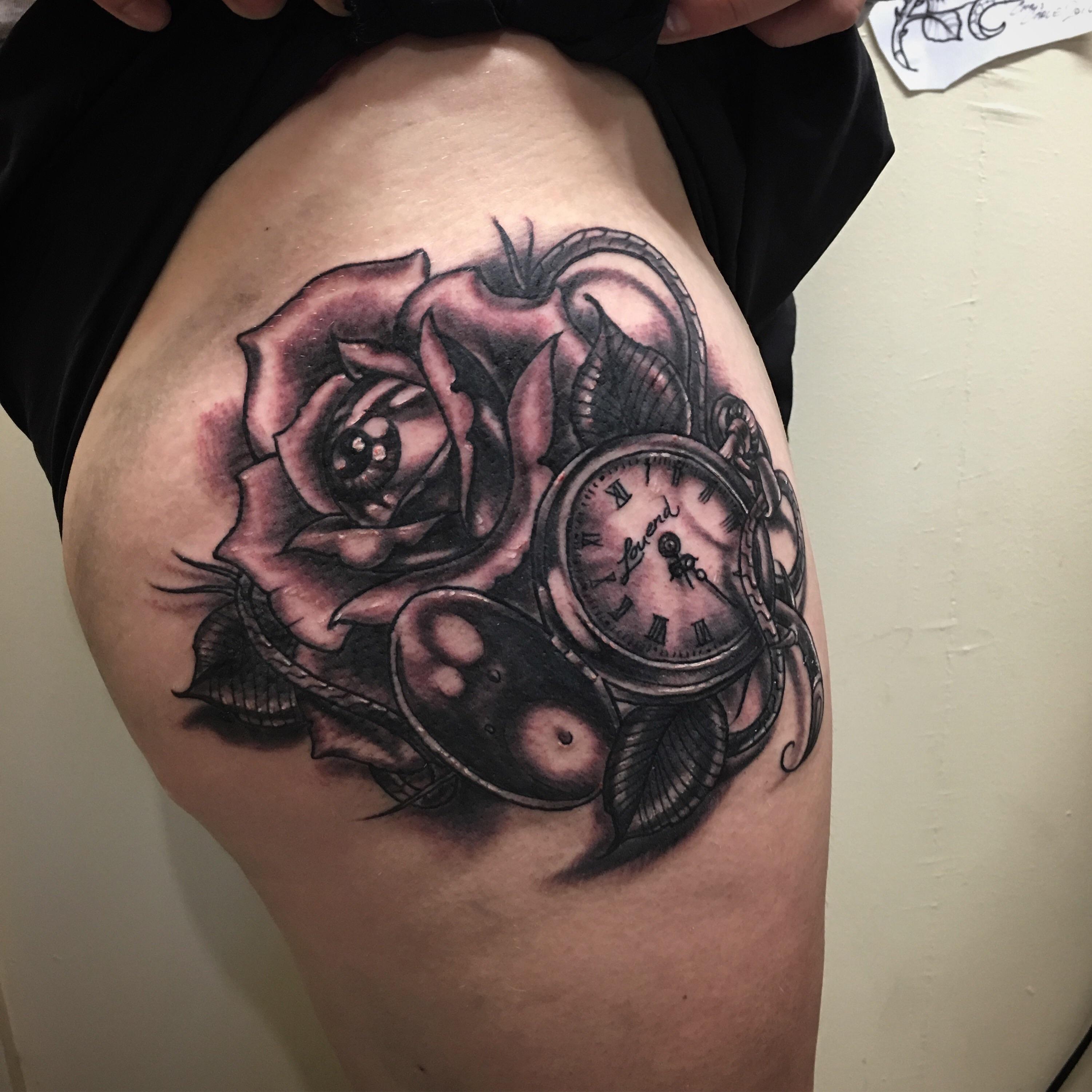 Eyeball rose and clients grandmothers pocket watch by Chris Cable red centre tattoos Alice springs